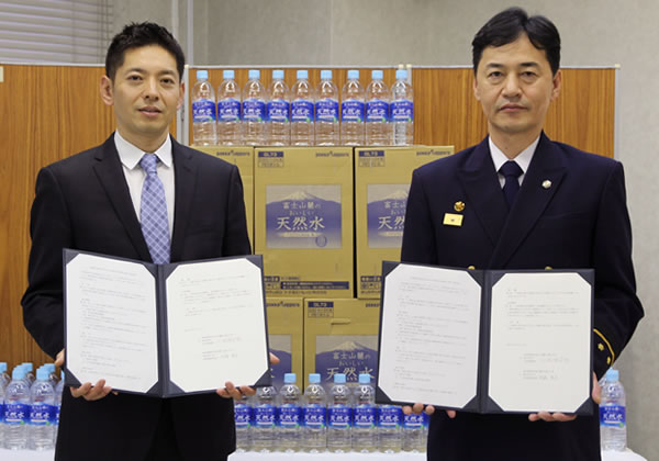 牛込消防署で行われた調印式当日、天然水をバックに協定書を手にする上田署長(当時)と後藤社長(左)
