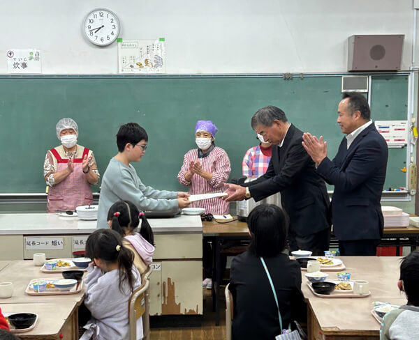 そして参加した6年生の児童代表からは、「この朝ごはんは、普段の給食とはまた違った、『特別なおいしさ』がある時間です。・・この感謝の気持ちを忘れずに、たくさん食べて、学校生活を頑張ります」と書かれた弊社宛のメッセージが手渡され、社員にとっても心温まるひとときとなりました。