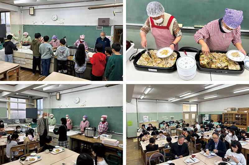 当日は、地域ボランティアの皆様が丹精を込めて準備した「豚肉のマヨポン焼き」をおいしくいただきました。主に高齢者で構成されるボランティアの皆様にとっても、子どもたちと触れ合い「おいしかった」と声をかけられるのが元気の源になっているとのことです。