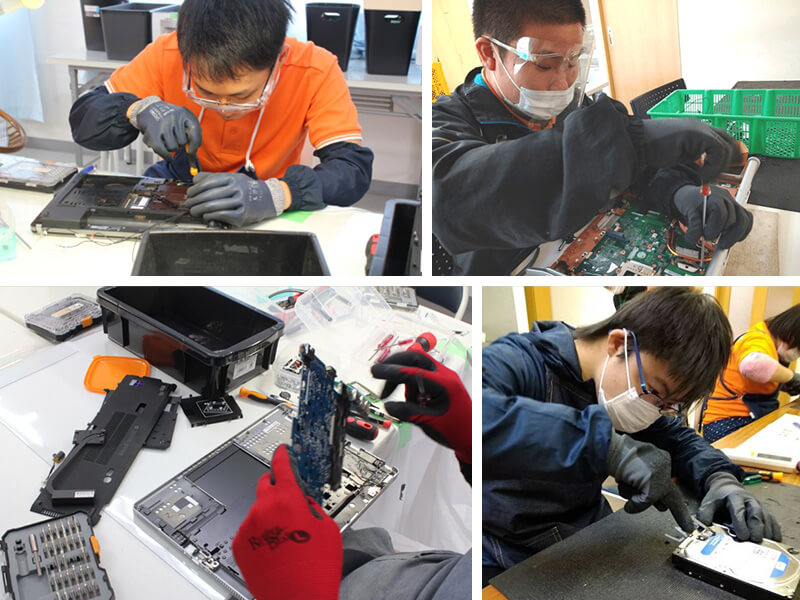 使用済パソコンの分解・解体作業を行うマイスターの皆さん