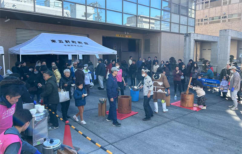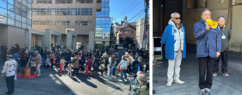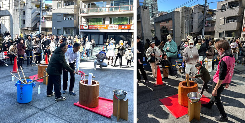 当日は晴天に恵まれ約600 名の老若男女が参加。吉住健一新宿区長も駆け付けてくださり、「ヨイショ!」という威勢の良い掛け声に包まれながら共に餅つきを楽しまれました。